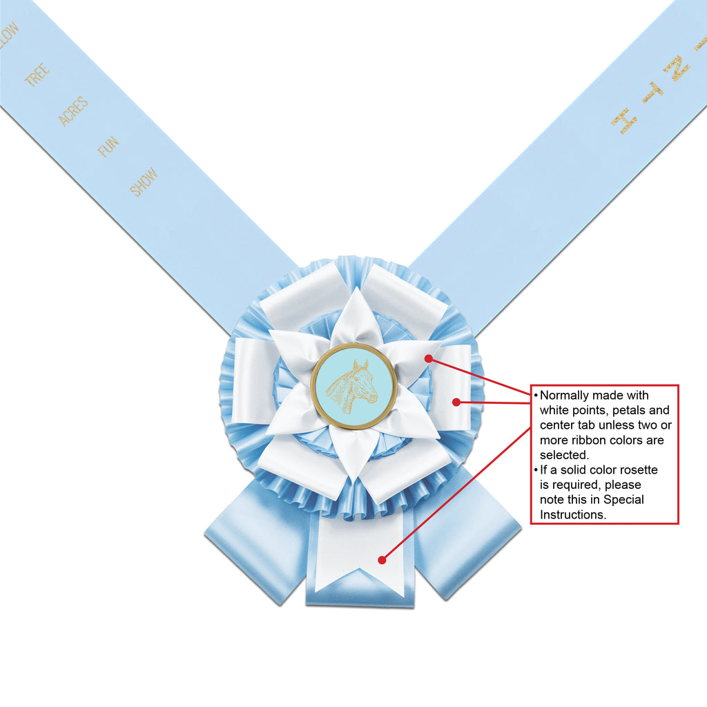 - 6-1/2” rosette with outer pleating, 1 row of white petals, 1 row of white points, inner pleating and 2-1/2" streamers