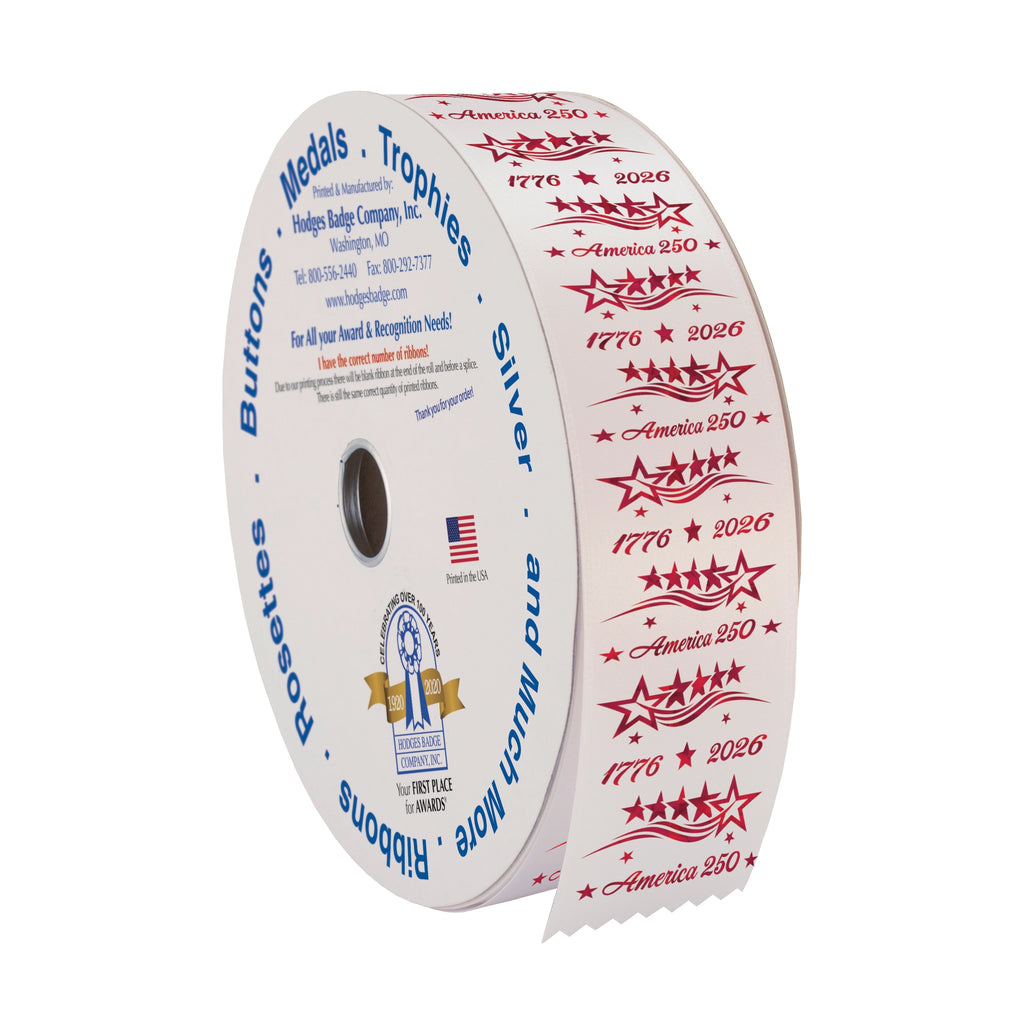 Can I order this ribbon in a different color or custom design? This ribbon is available as shown only, white ribbon with the red America 250 patriotic design. Custom color or design options are not available for this express product. For custom ribbon options, please contact us directly, or see product https://hodgesbadge.com/products/2-x-100-yards-custom-award-ribbon-roll